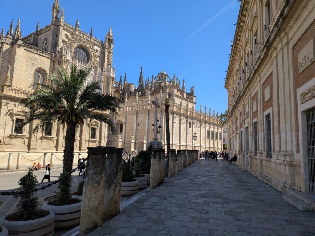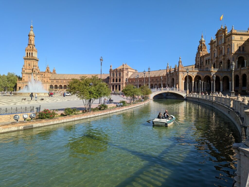 Wir waren schon auf dem Plaza de España mit Mosaiken der spanischen Städte, auf dessen Wasseranlage Boote fahren. In palmenumsäumten Parks. Orangenbäume und Sternwarte erinnern mich an „Das Orangemädchen“ von Jostein Gaarder. Habe mir pinke Happy Socks mit Avocados mit Cowboyhüten gekauft. Kathedrale, Buchhandlung, Antiquariat, Herkulessäulen. Straßenmusiker, die „Guantanamera“ spielen.