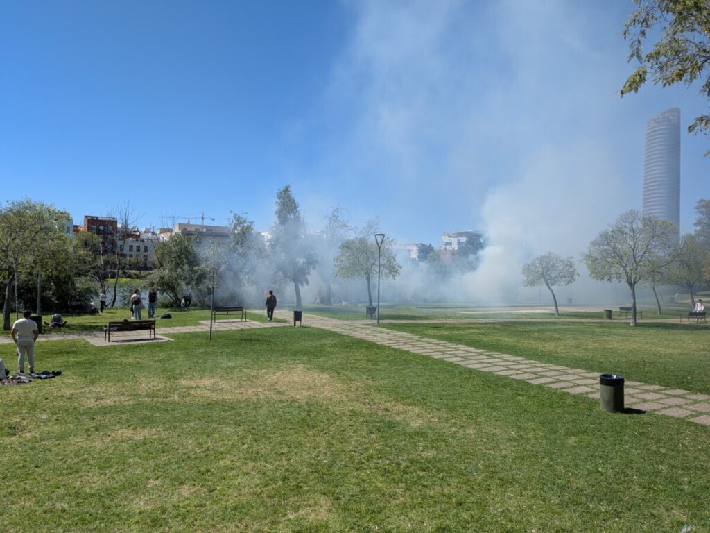 In Sevilla gelandet, nehmen wir zuerst einen Bus für 6€ und dann die Metro für 70 Cent und sehen dabei viele Jugendliche in Anzügen oder Kleid – sie erinnern uns an die Serie „Elité“. Auch Erwachsene. Erst denken wir an einen Abschlussball, dann finden wir heraus: Es ist Palmsonntag, der Sonntag vor Ostern, an dem sich viele Spanier*innen chic kleiden und einen schönen Abend in der Stadt verbringen. Wir sind alles andere als vornehm angezogen. Wollen die Reise in Form von später aneinandergereihten Kurzvideos filmen.