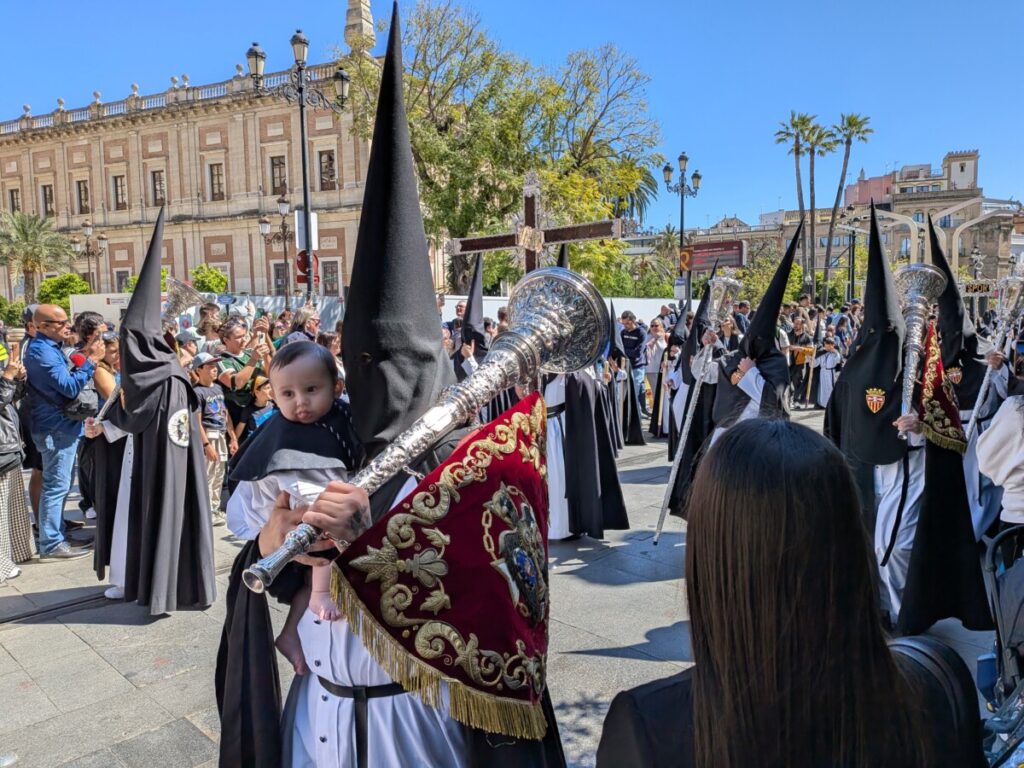 Wir sehen zwei Personen mit weißen Gewändern und spitzzulaufenden Hüten. L. bekommt zuerst einen Schreck, aber ich habe sie schon in Madrid gesehen und weiß, sie haben nichts mit dem Ku-Klux-Klan zu tun, sondern sind Teil der Osterprozession, in die wir später geraten. Angeführt von einem Spielmannszug, folgt ein nicht enden wollender Zug schwarz gekleideter Zipfelmützen.