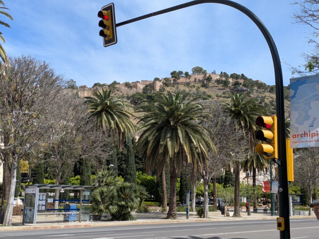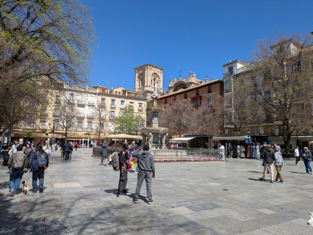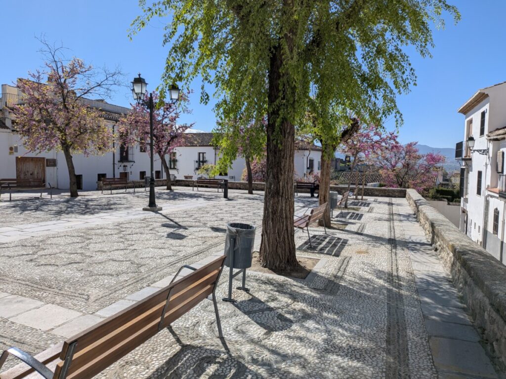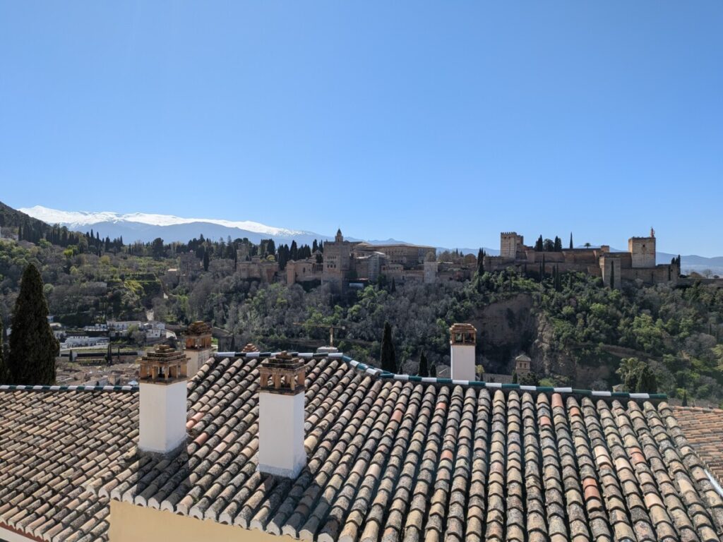 Heute fahren wir mit dem Bus für 1,90€ nach Granada, an einem wunderschönen Birkenwald vorbei, das Gras darin saftig grün. Auch in Granada gibt es Orangenbäume, Schulen, die Uni, arabische Schriftzüge und Cafés, um Tage in der Sonne beginnen zu lassen. Tapas-Bar an Tapas-Bar in der Altstadt – und Tourist*innen über Tourist*innen auf dem Weg zu einem Aussichtspunkt, wo zwei Männer Gitarre spielen und von wo aus man die Alhambra (Burg) auf dem benachbarten Hügel vor den schneebedeckten Bergen sehen kann, umgeben von Palmen und Kirschblüten.