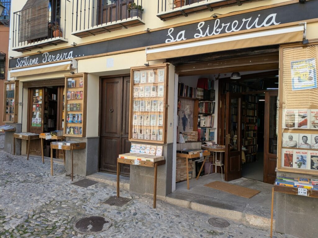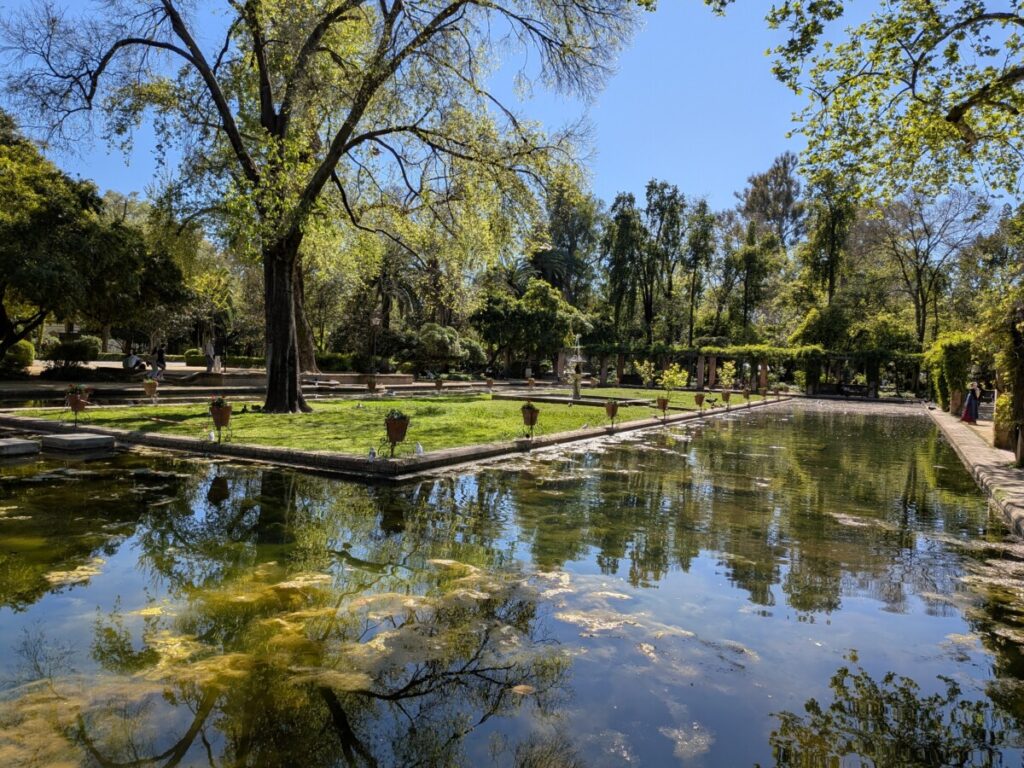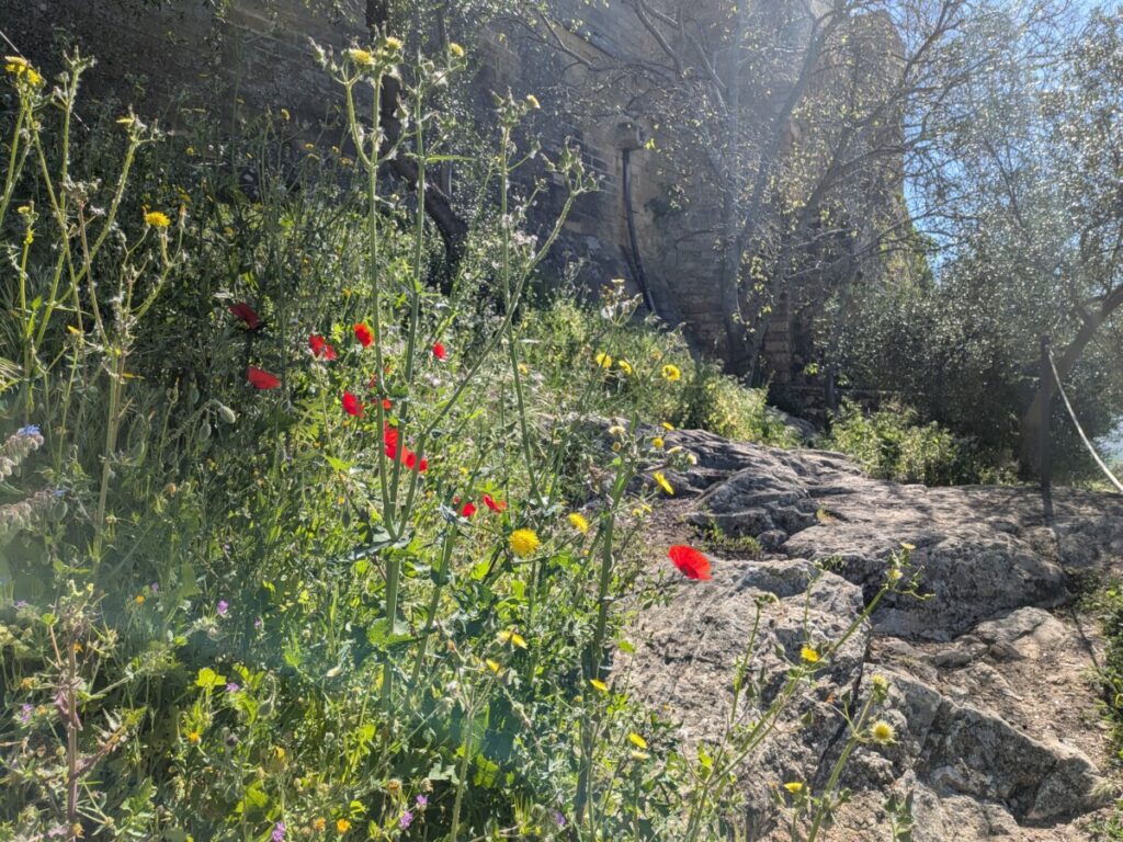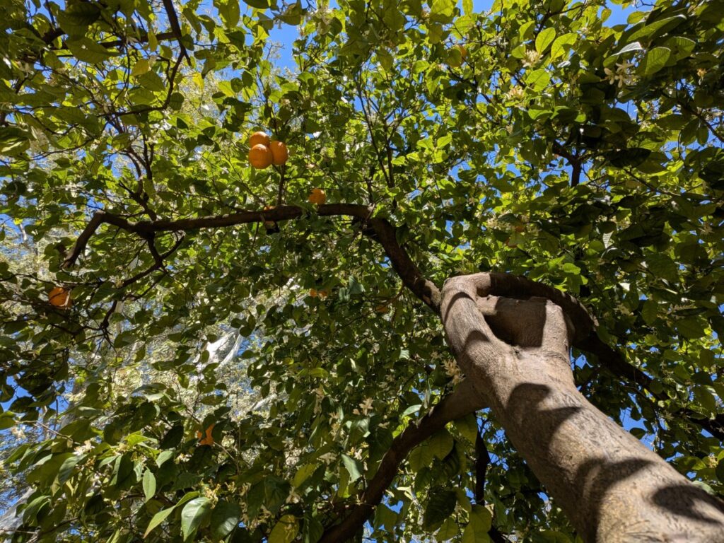 Heute fahren wir mit dem Bus für 1,90€ nach Granada, an einem wunderschönen Birkenwald vorbei, das Gras darin saftig grün. Auch in Granada gibt es Orangenbäume, Schulen, die Uni, arabische Schriftzüge und Cafés, um Tage in der Sonne beginnen zu lassen. Tapas-Bar an Tapas-Bar in der Altstadt – und Tourist*innen über Tourist*innen auf dem Weg zu einem Aussichtspunkt, wo zwei Männer Gitarre spielen und von wo aus man die Alhambra (Burg) auf dem benachbarten Hügel vor den schneebedeckten Bergen sehen kann, umgeben von Palmen und Kirschblüten.