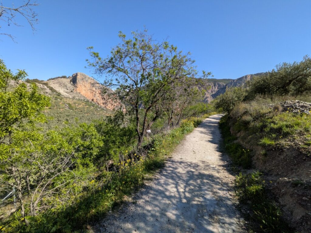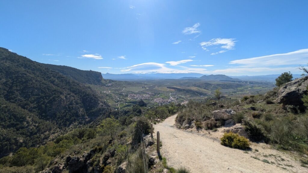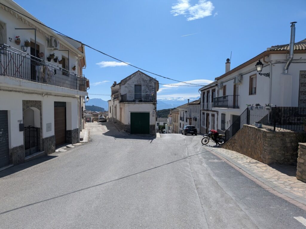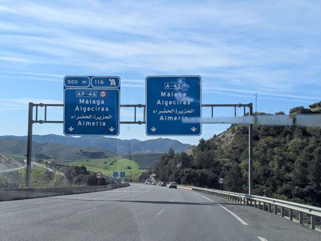 Es ist 16:00. Wir haben zwei Stunden, bevor die Rezeption in Pinos Puente schließt, und vor uns immer wieder LKWs, u.a. von Schmitz Cargobull. Es ist eine Fahrt ohne Wasser und Essen. Die Landschaft ist hügelig bis bergig, auf einem Bergkamm in der Ferne liegt Schnee. Um 18:00 verpassen wir auch noch die Ausfahrt und kommen eine Viertelstunde zu spät an. Am Tresen des Restaurants bekommen wir dennoch die Karte für unser Zimmer und können einchecken.