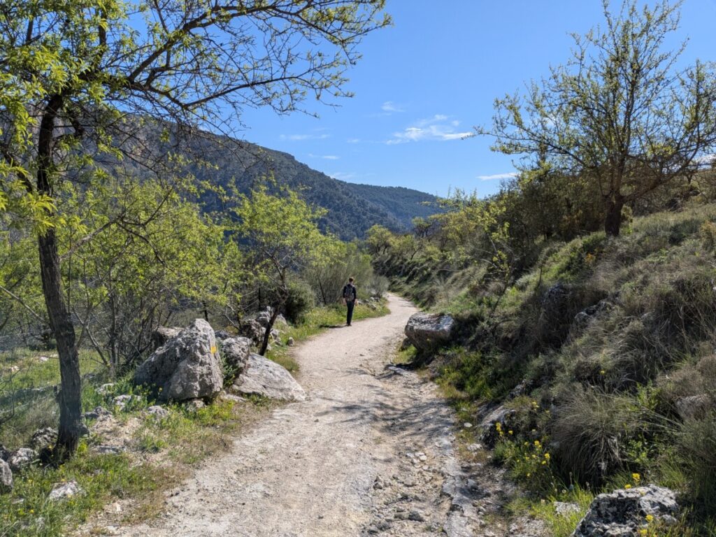 Moclin weist eine Burgruine auf einem Felsen auf. Wir wandern vier Stunden, meist bergab durch die grüne, felsige Landschaft in Richtung des schneebedeckten Bergkamms. Diese Strecke ist Teil des Jakobwegs. Abwechselnd träume ich mich in eine längere Tour und in den Yosemite-Nationalpark, in dem ich noch nie war.