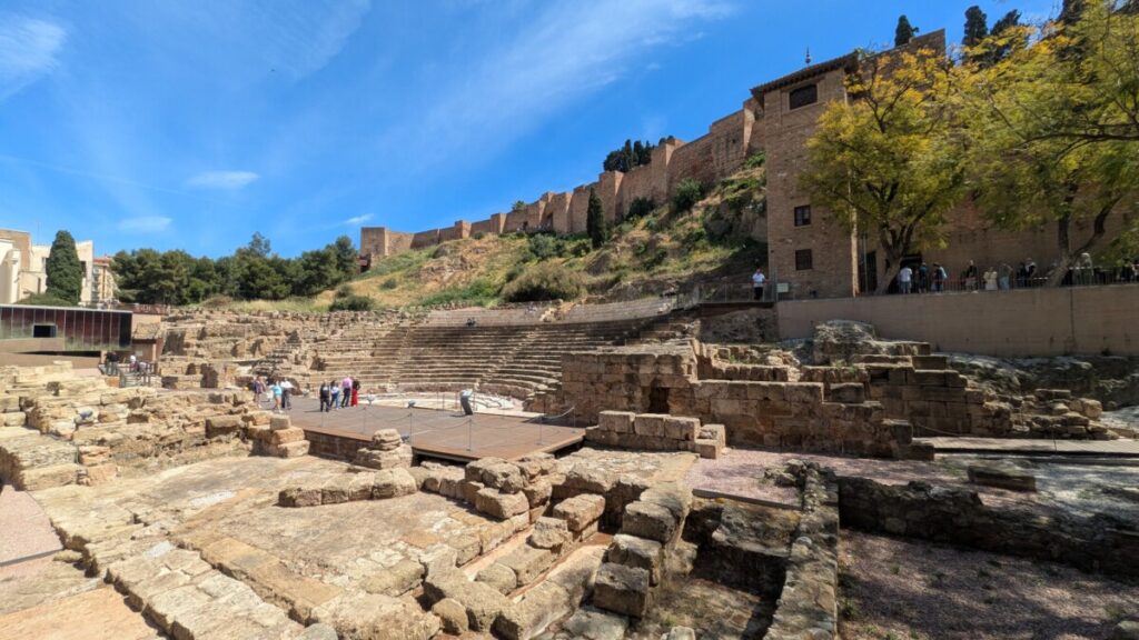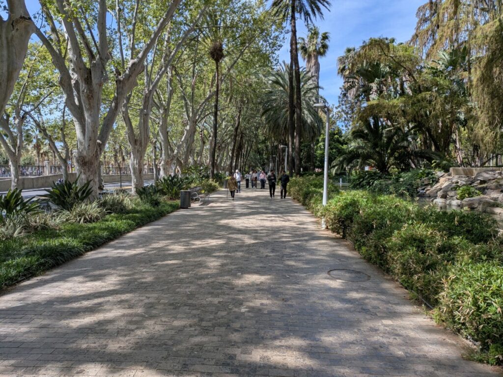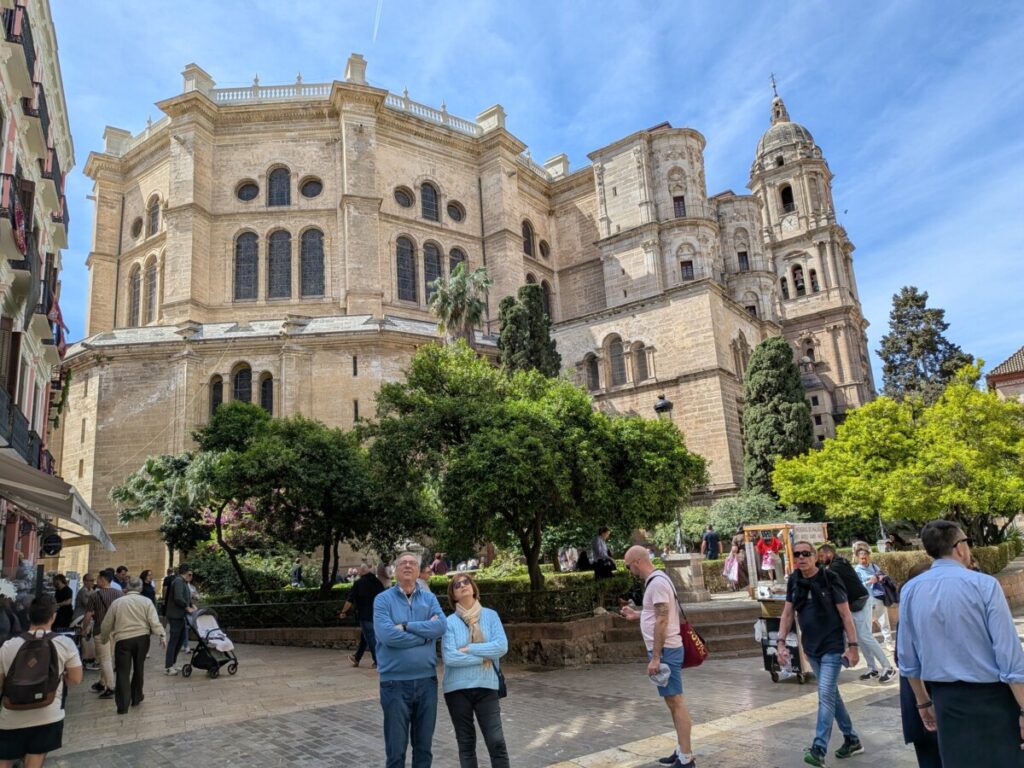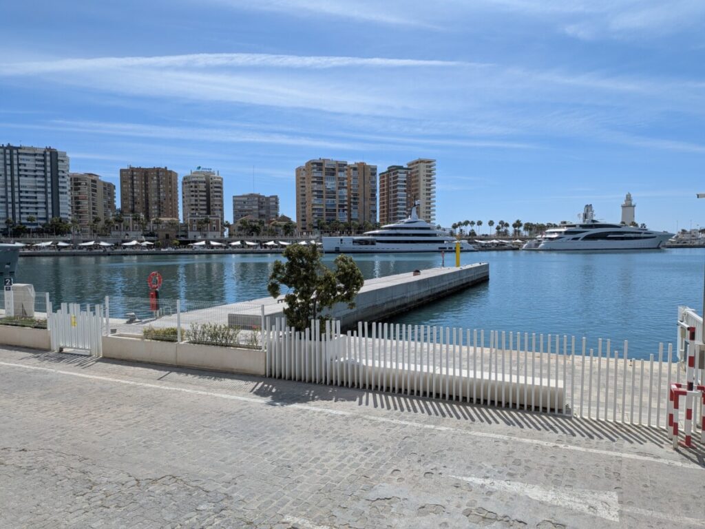 Wir fahren weiter, nach Malaga ans Meer. Am Hafen die nächste Tourist*innenhölle. Kreuzfahrtschiff, Yachten, Burg, Kathedrale, schöne, alte Gebäude, Fahrradwege, die Straßen oft beschattet, ein cooles T-Shirt-Geschäft, Straßenkünstler, einer mit Zeitungen eingekleistert, die Falafelrolle günstig, das Dixi-Klo eklig.