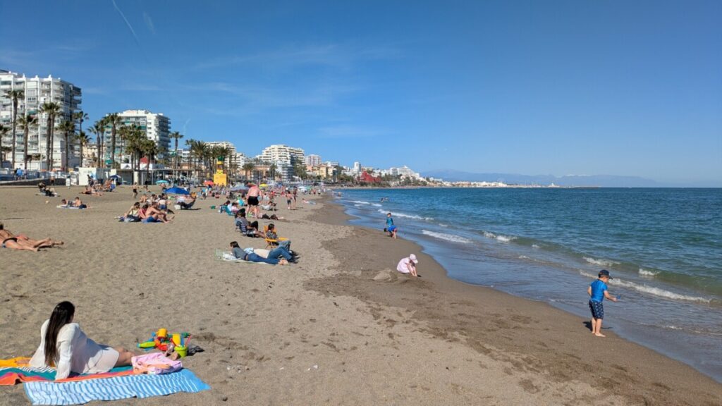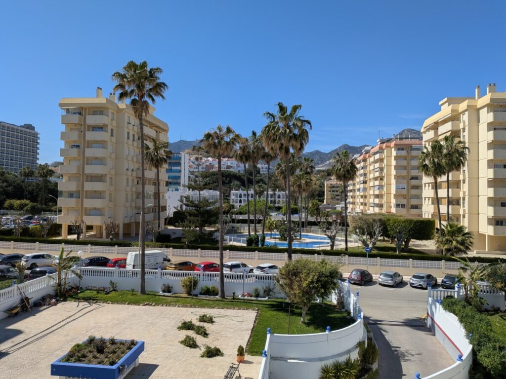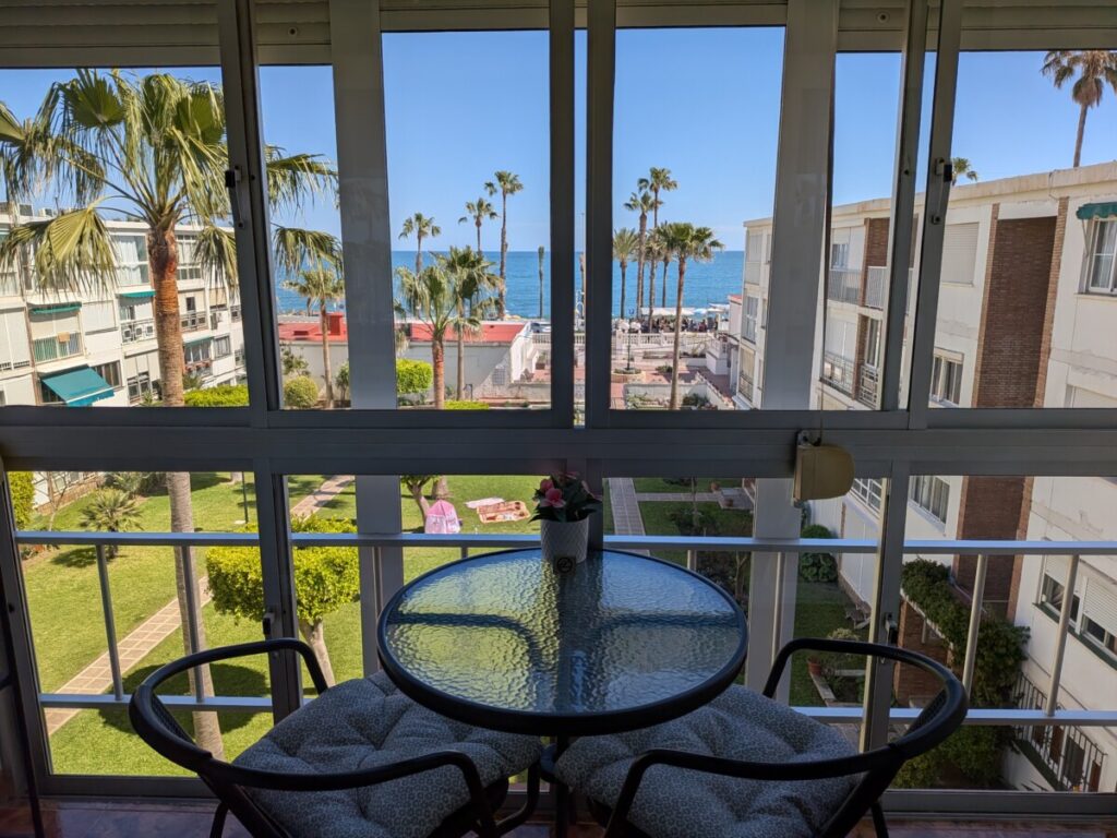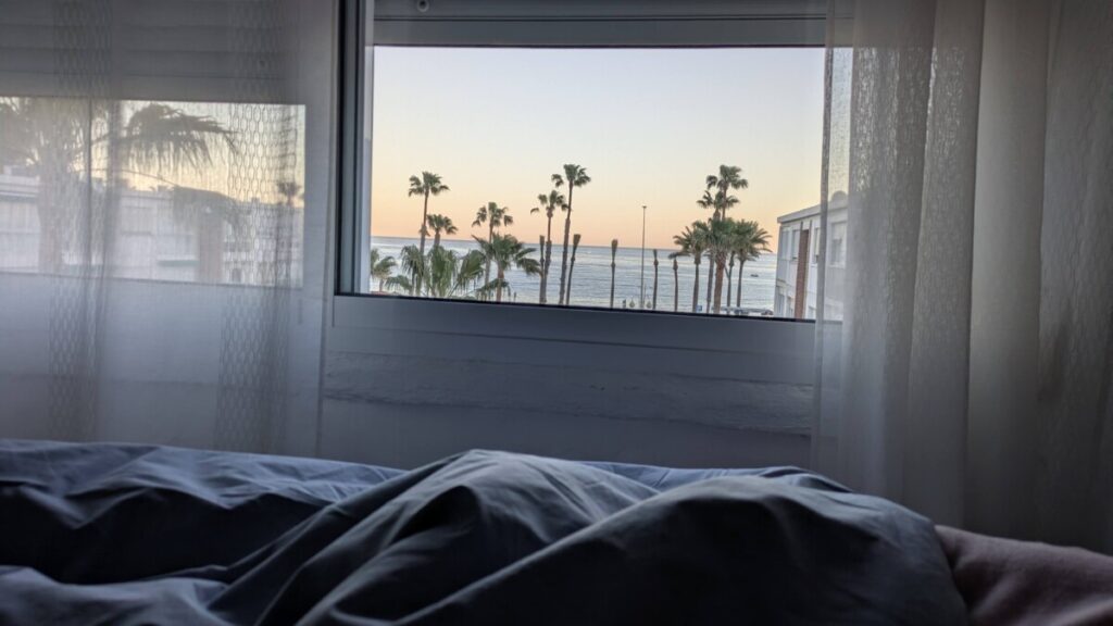Dann zu unserer Unterkunft nach Benalmadena Costa direkt am Strand, Palmen und Wohnanlagen mit Pools, wie in „Dexter“, wie in Miami, unser Wintergarten zeigt zum Meer hinaus, das Wasser ist noch zu kalt zum Schwimmen, wir liegen im Sand, in der Ferne ein Riesenrad wie in L.A., in noch weiterer Ferne der schneebedeckte Bergkamm von der anderen Seite.
