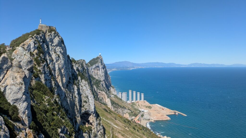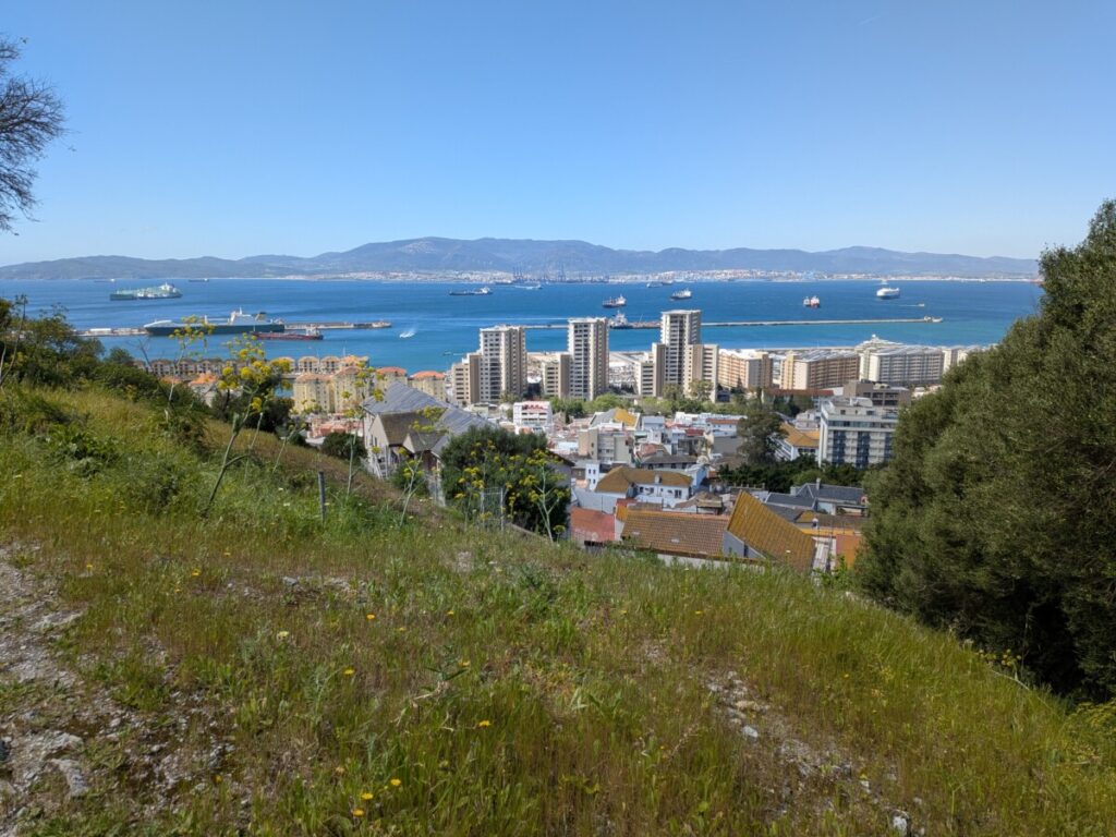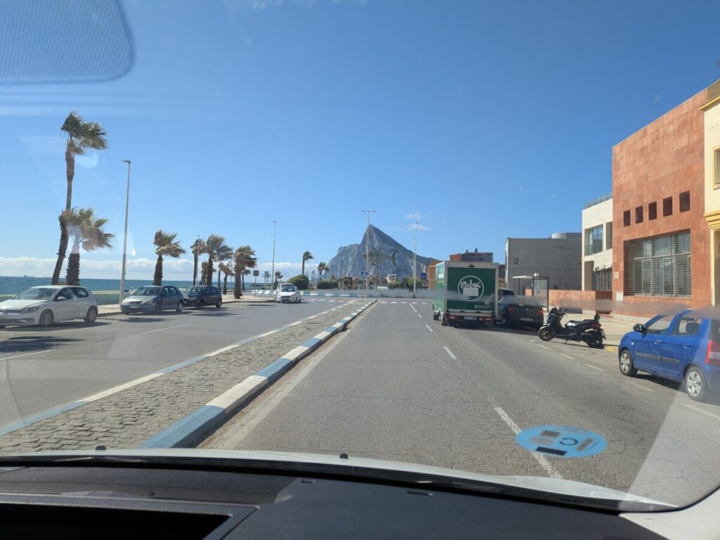 Der Felsen von Gibraltar erhebt sich in der Ferne über dem Meer. In das britische Gebiet kommen wir mit unseren Persos rein. Die Ampel am Flughafen steht auf Grün – wir überqueren die Start- und Landebahn. Schüsse werden abgefeuert, Vögel vertrieben. Wind bläst fast meine Klappe weg. Gibraltar ist Großbritannien im Süden mit Pubs, Fish and Chips und einer Kirche im britischen Baustil. Hähne laufen frei herum und wenige Hühner. Warum haben diese Hennen vom Hahnentritt keine kahlen Stellen?