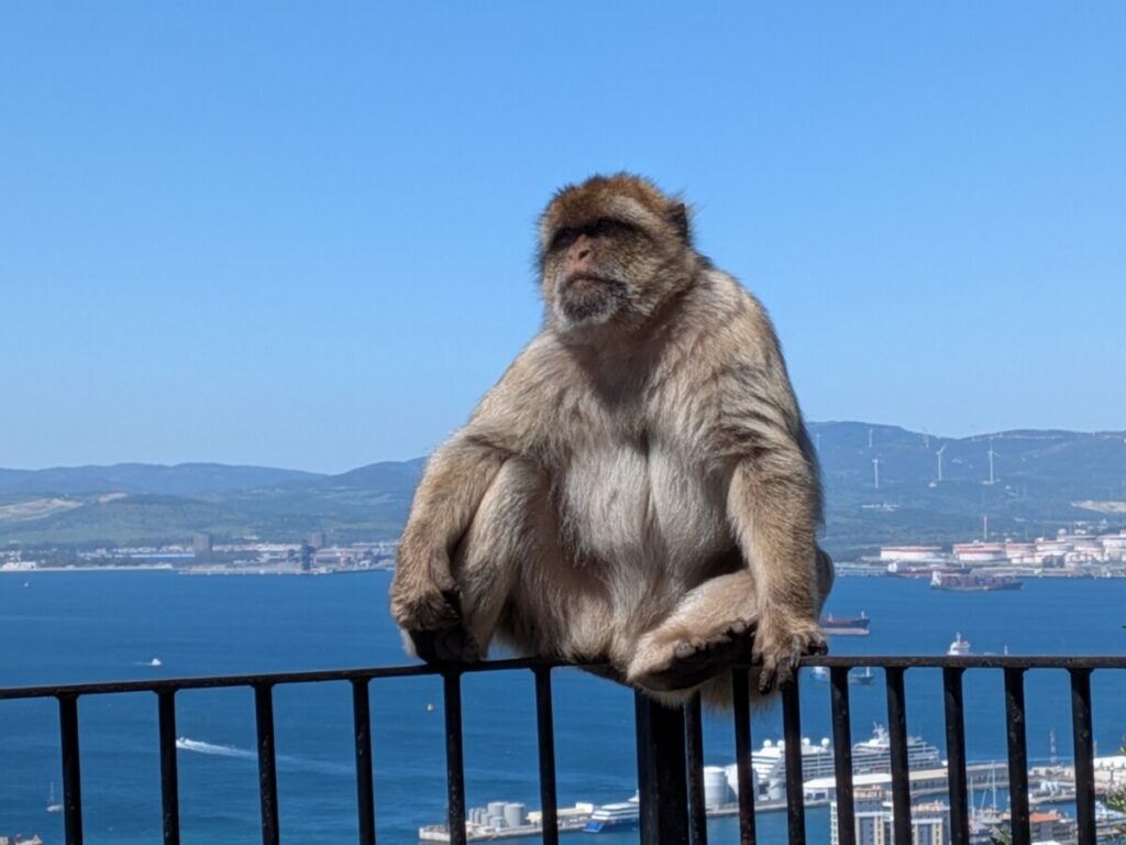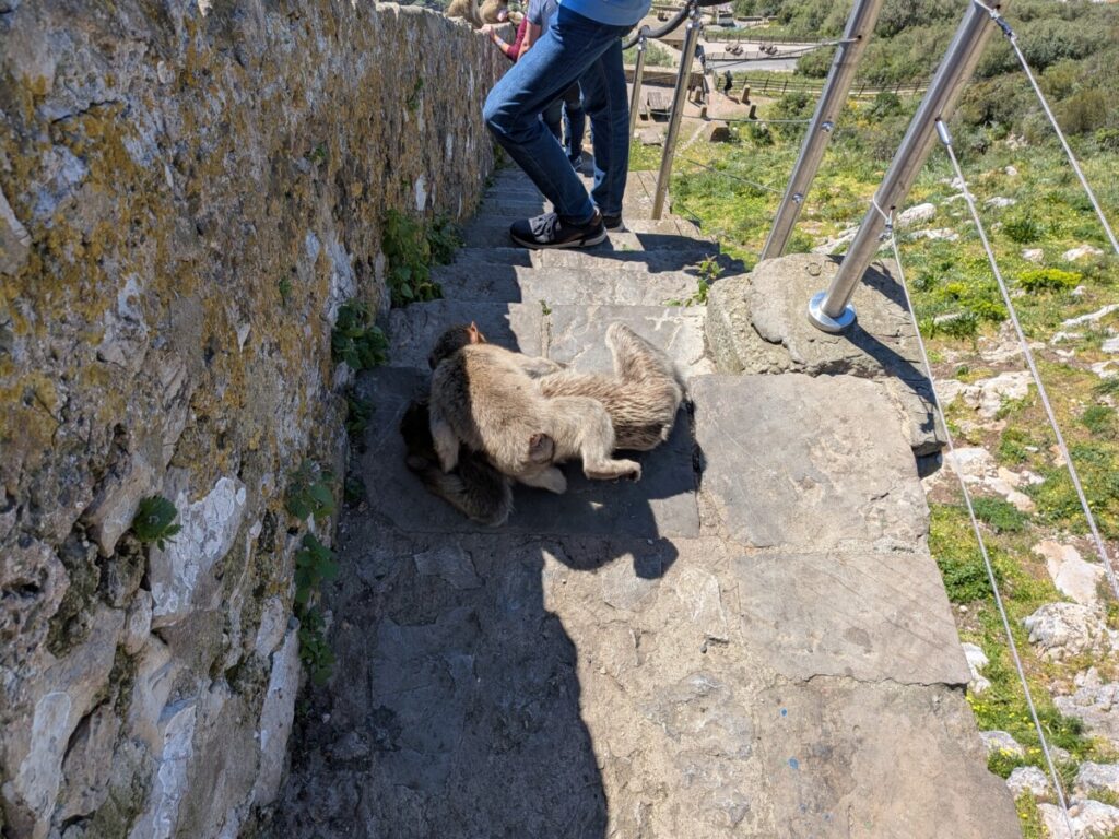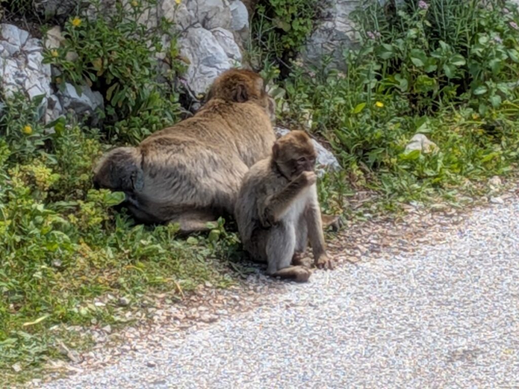 In der Ferne ist der afrikanische Kontinent zu sehen. Die Affen sitzen geschützt auf der Spitze des Felsen, rangeln, springen von Baum zu Baum oder liegen auf der Straße und lausen sich gegenseitig, wie in Studien über Altruismus. In Taxis werden Menschen hochgekarrt, die nicht hochlaufen, aus welchen Gründen auch immer. Oben reihen sich die Autos aneinander. Hier sitzen auch wieder viele Affen, klauen Chips und Oreos und öffnen die Plastiktüten gekonnt. Obwohl es verboten ist, die Tiere zu füttern, tun es manche doch, die nichts gelernt haben. Ein Mann fasst einem Affen an den Kopf und der Affe schlägt zurück. Ungeheuerlich! Der Mann.
