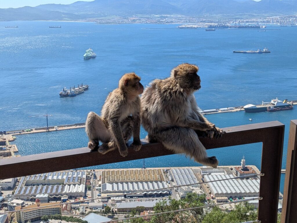 Der Eintritt auf den Felsen von Gibraltar kostet 30 Pfund. Schon nach wenigen Schritten sehen wir die ersten Berberaffen. Ein Junges springt über die Schulter eines Mädchens, das sich am Geländer eines Aussichtspunktes abstützt. Die Affen geben tolle Fotomotive ab und spekulieren im Gegenzug auf Essbares. Die Queen habe 1954 mit ihnen Freundschaft geschlossen, sagt ein Schild.