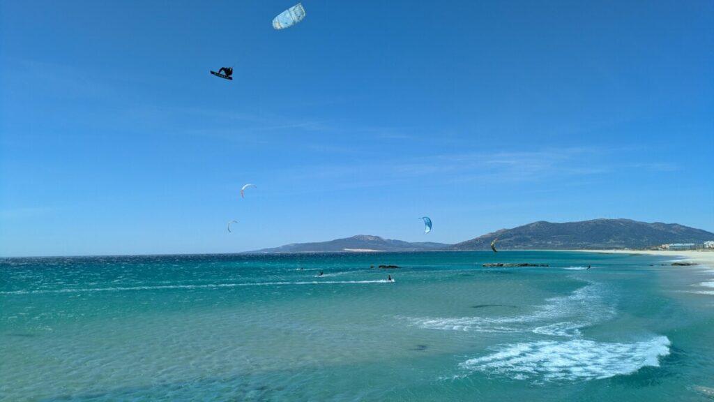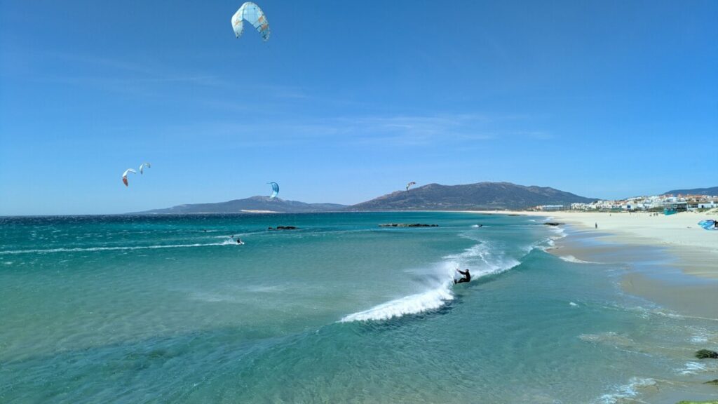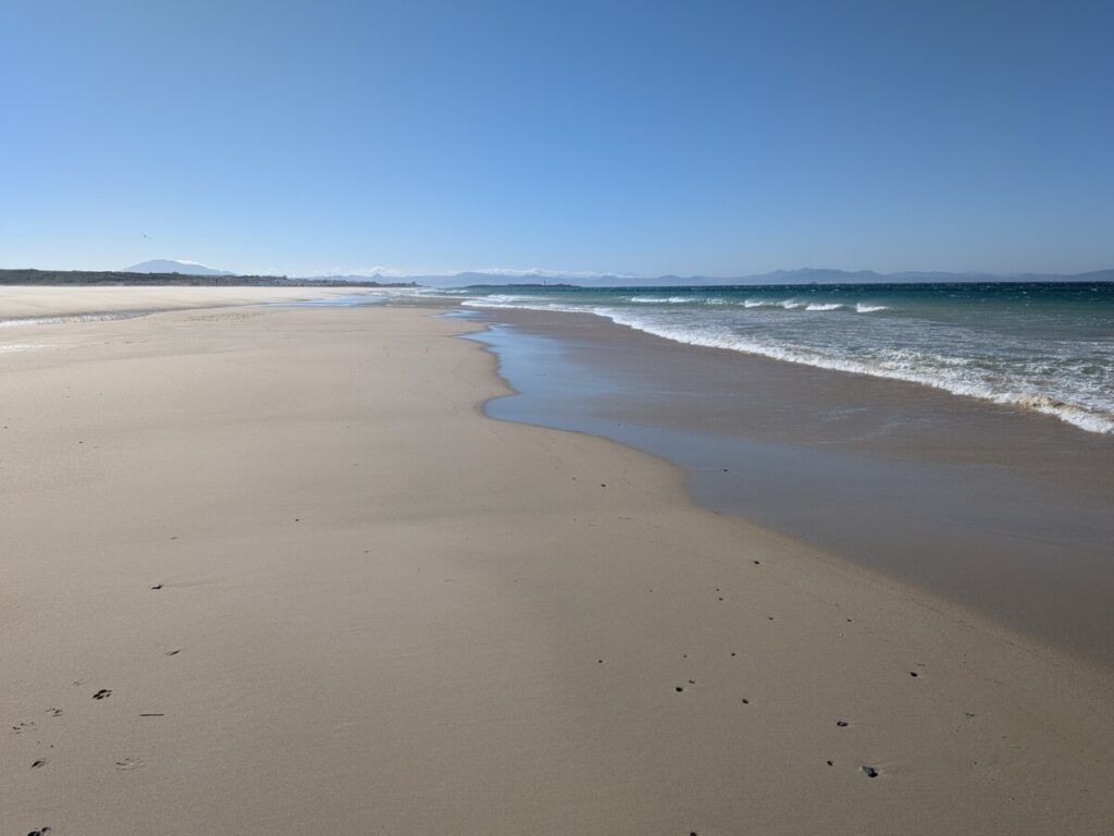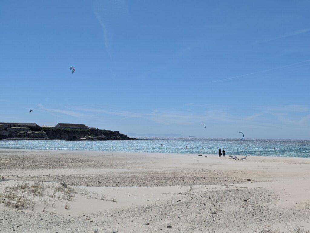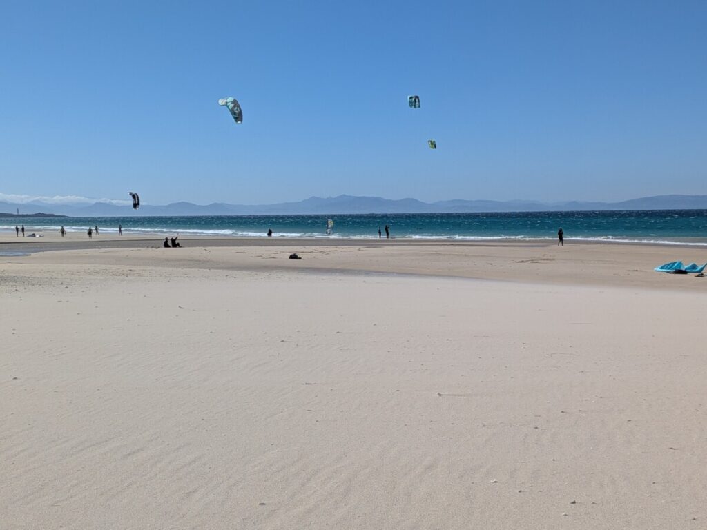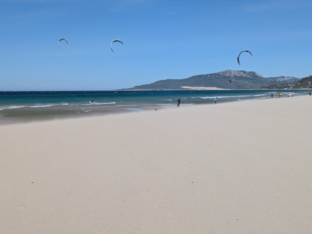 Ostersonntag, zum Strand. Windstärke 6. Auf dem Wasser sind Schaukronen zu sehen. Der Sand peitscht schmerzhaft gegen unsere Waden. Laut Wegweiser 15 Kilometer bis Afrika – wir sehen die Berge an Afrikas Küste. Der Sandstrand ist weit. In der Ferne der Leuchtturm von Tarifa, der südlichste Punkt der iberischen Halbinsel, links von uns. Rechts von uns der erste Schirm eines Kitesurfers. Als noch mehr auftauchen, waten wir durch einen reißenden Fluss, der ins Meer mündet. Meine Hose wird dabei nass, trocknet im Wind aber schnell. Wir beobachten die Kitesurfschüler*innen beim Groundhandling und bei den ersten Surfversuchen. Weiter weg jagt ein Kitesurfer über die Wellen und macht, hoch in die Luft segelnd, Kunststücke. Wir bleiben, bis uns im Wind zu kalt wird. Und finden dann noch mal auf einem Brückensteg Rast, wo der Sand uns nicht mehr in Schuhe, Hosentaschen und Augen fliegt und wir eine herrliche Aussicht auf die grünen Hügel haben.