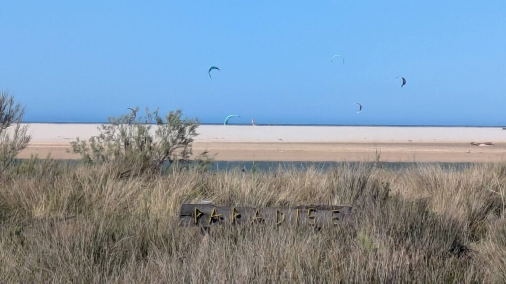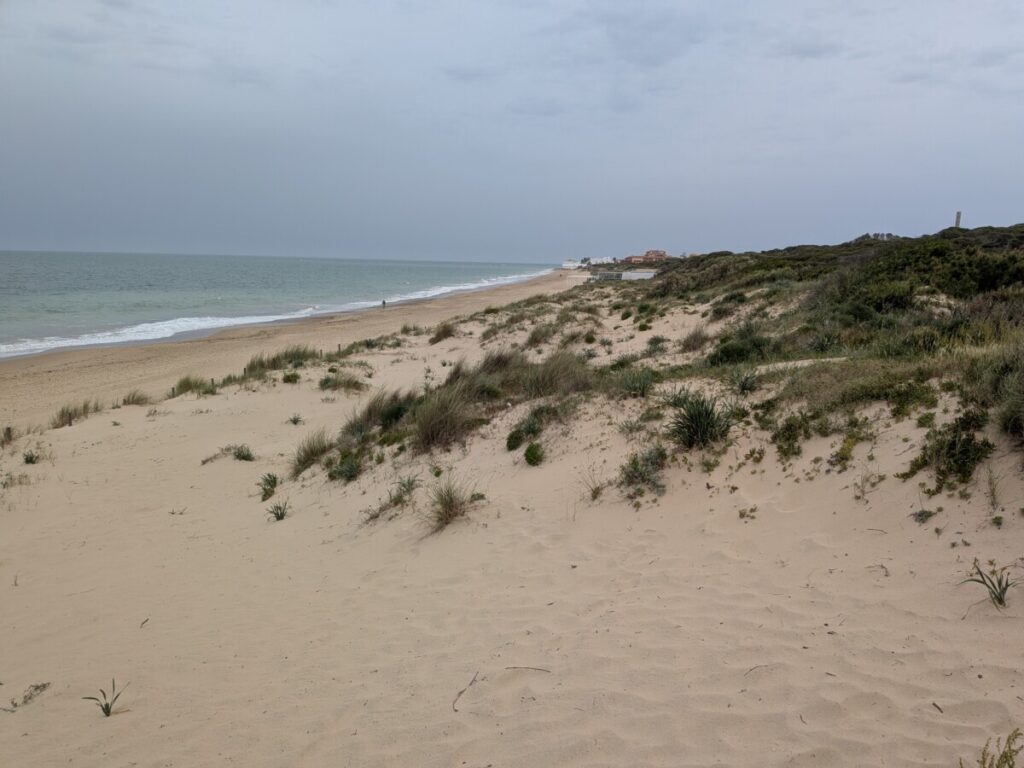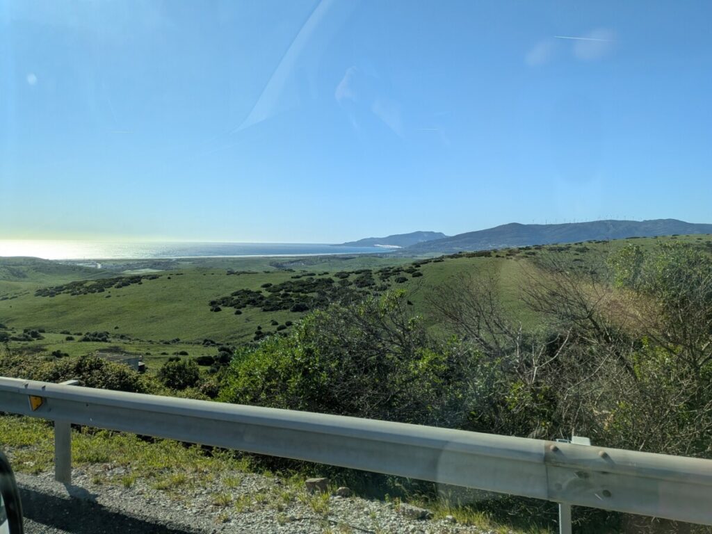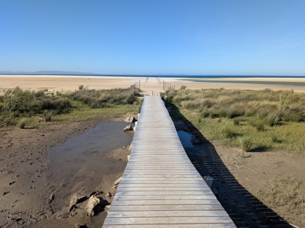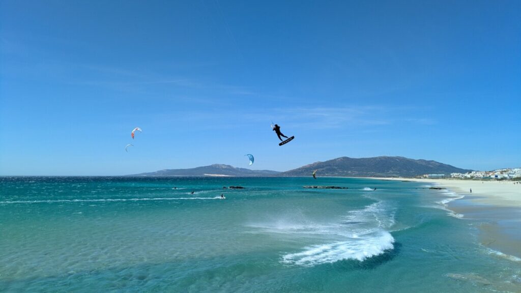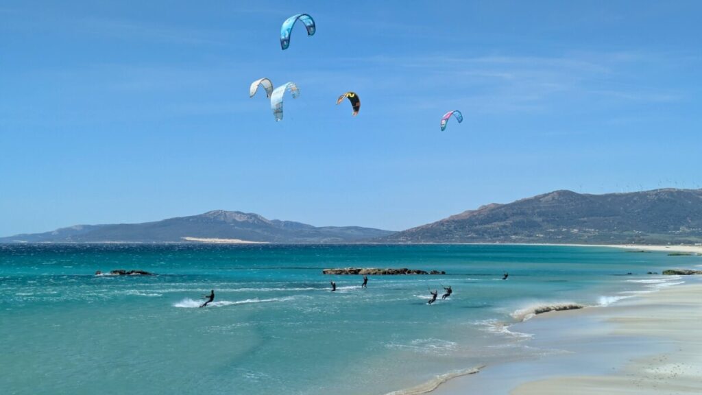 Ostersonntag, zum Strand. Windstärke 6. Auf dem Wasser sind Schaukronen zu sehen. Der Sand peitscht schmerzhaft gegen unsere Waden. Laut Wegweiser 15 Kilometer bis Afrika – wir sehen die Berge an Afrikas Küste. Der Sandstrand ist weit. In der Ferne der Leuchtturm von Tarifa, der südlichste Punkt der iberischen Halbinsel, links von uns. Rechts von uns der erste Schirm eines Kitesurfers. Als noch mehr auftauchen, waten wir durch einen reißenden Fluss, der ins Meer mündet. Meine Hose wird dabei nass, trocknet im Wind aber schnell. Wir beobachten die Kitesurfschüler*innen beim Groundhandling und bei den ersten Surfversuchen. Weiter weg jagt ein Kitesurfer über die Wellen und macht, hoch in die Luft segelnd, Kunststücke. Wir bleiben, bis uns im Wind zu kalt wird. Und finden dann noch mal auf einem Brückensteg Rast, wo der Sand uns nicht mehr in Schuhe, Hosentaschen und Augen fliegt und wir eine herrliche Aussicht auf die grünen Hügel haben.