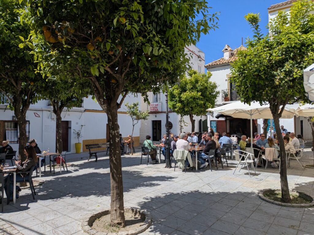 In der Stadt essen wir noch ein Eis. Danach fahren wir noch etwas durch die grüne Landschaft, das Münsterland Andalusiens, mit Pferden, Stieren, Hühnern und einer Mischung aus Reiher und Brieftaube.