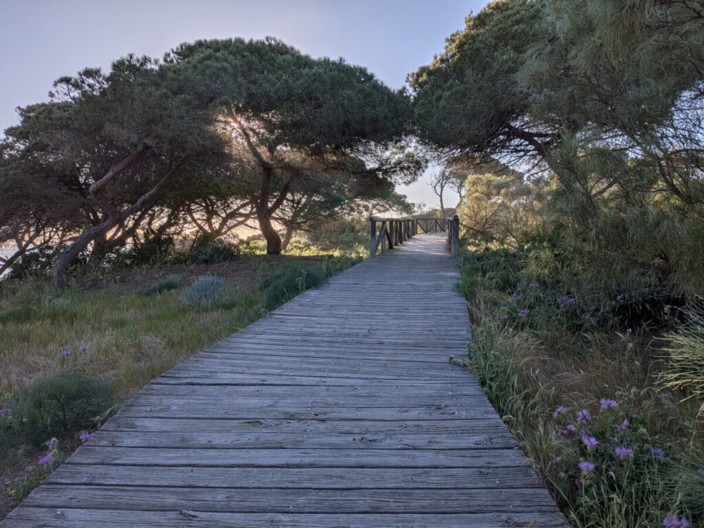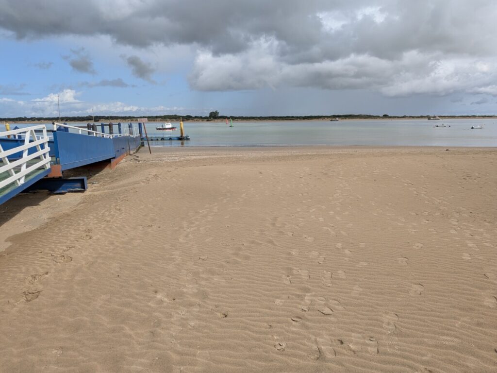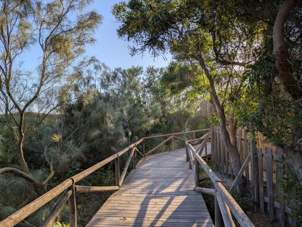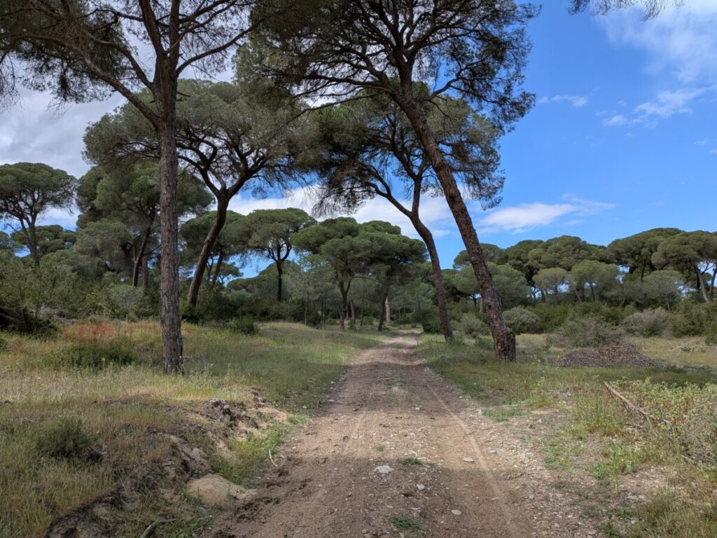 Am nächsten Tag fahren wir zum zweiten Mal zum Fähranleger zum Parque Nacional de Doñana, man kommt nur mit der Fähre über den Fluss. Gestern sind wir wieder weg, weil plötzlich Regen mit Gewitter angesagt war und nun sagt uns der Fährmann, der Park sei heute verboten. Statt uns fahren mehrere Geländewagen und Personen mit der Fähre – wahrscheinlich ein Suchtrupp und im Nationalpark ist etwas passiert. Wir fahren in den Pinienwald „Pinar de la Colonia Monte Algaida“, wo wir mehrere Ameisenstraßen finden, die wir bis zum Loch der Königin verfolgen. Zwei Stunden wandern wir dort. Gehen danach wieder bei Mercadona essen und für eine ausgedehnte Pause ins Hotel. Ein Abendspaziergang mit Strand, Pinienwald und Blick von außen in den Botanischen Garten sowie von einer Tribüne aus aufs Fußballtraining von Teenagern ist später noch drin, bevor wir wie die letzten zwei Abende eine Folge mit dem Besten aus 40 Jahren „Verstehen Sie Spaß?“ sehen.