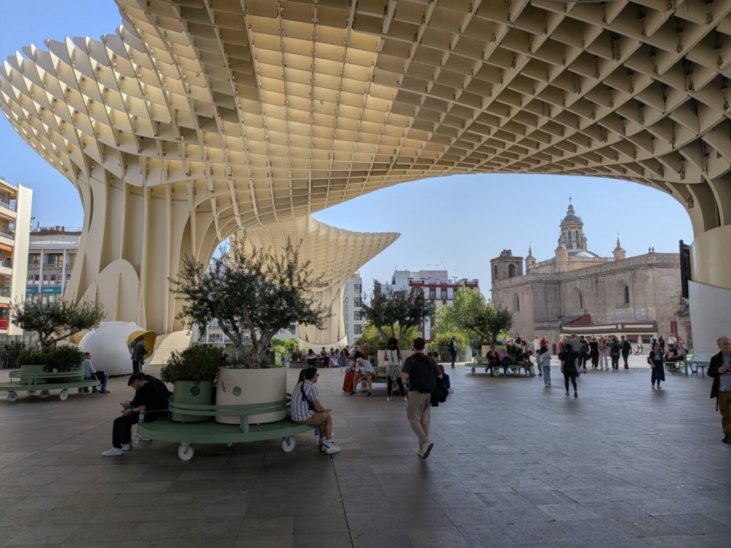 Der Autoverleih macht von 13 bis 16 Uhr Siesta, was wir nicht wissen. Wir bringen die Zeit in einer Kebab-Bude rum. Danach fahren wir zu Sevillas modernstem Wahrzeichen: „Las Setas“ – die Pilze wurden von einem deutschen Architekten entworfen und sehen mehr aus wie Waben als Pilze. Waben, die großflächig Schatten spenden. Darunter ist es schön kühl; die ganze Stadt wurde so angelegt, dass immer eine Brise weht. Ein wunderschöner Platz mit Bänken, Bäumen und Sicht auf eine imposante Kirche.